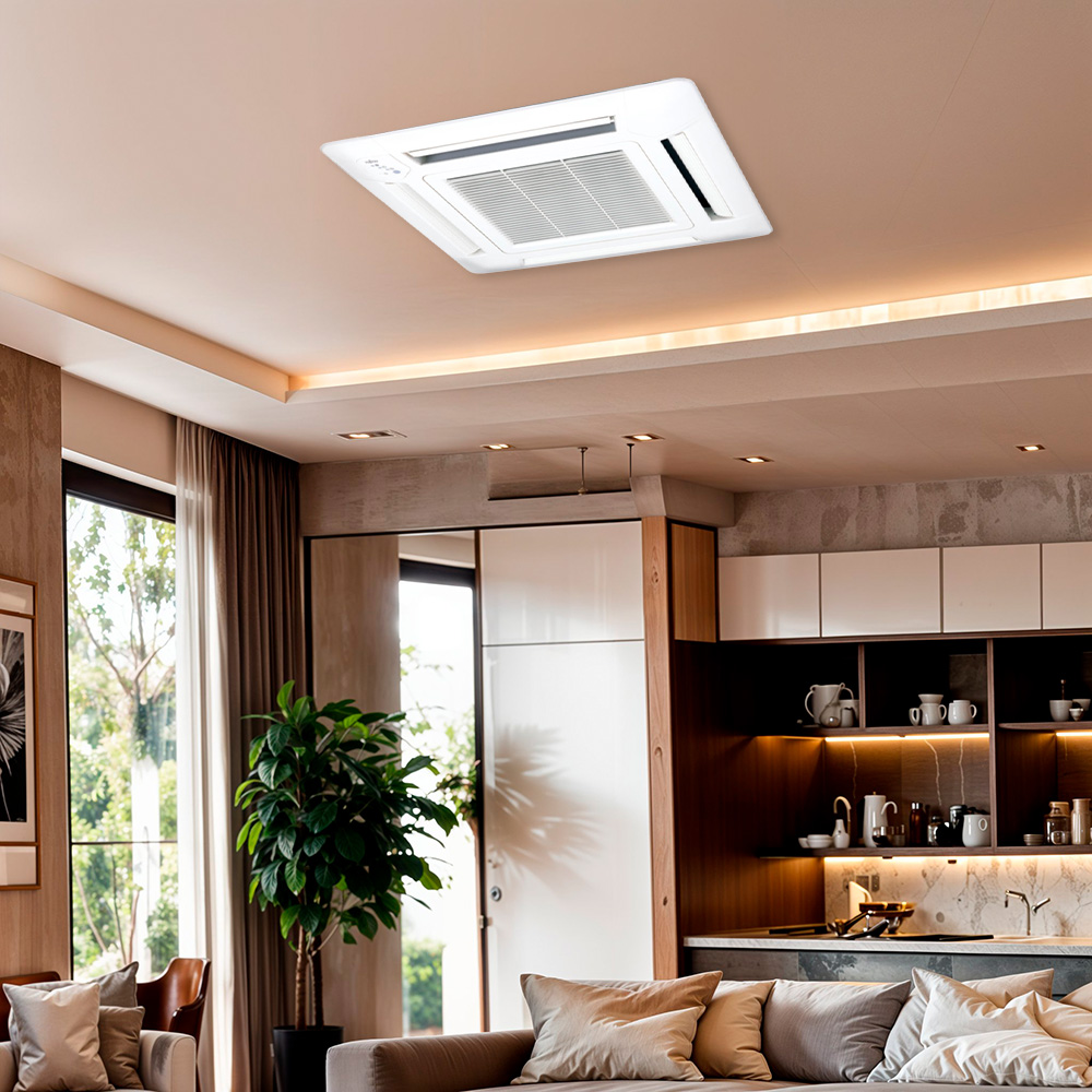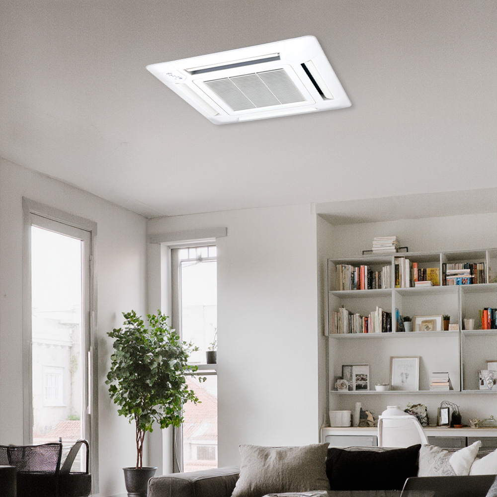 Ele cuida da sua saúde, porque tem indicador que avisa quando o filtro precisa ser limpo. O split cassete conta com a função de mudança automática alternando os modos de aquecimento e refrigeração, com base na temperatura do ambiente. O ventilador turbo promove uma distribuição de ar uniforme. A tecnologia inverter garante economia mais eficiente, atinge a temperatura rapidamente, operação mais silenciosa e temperatura mais estável.