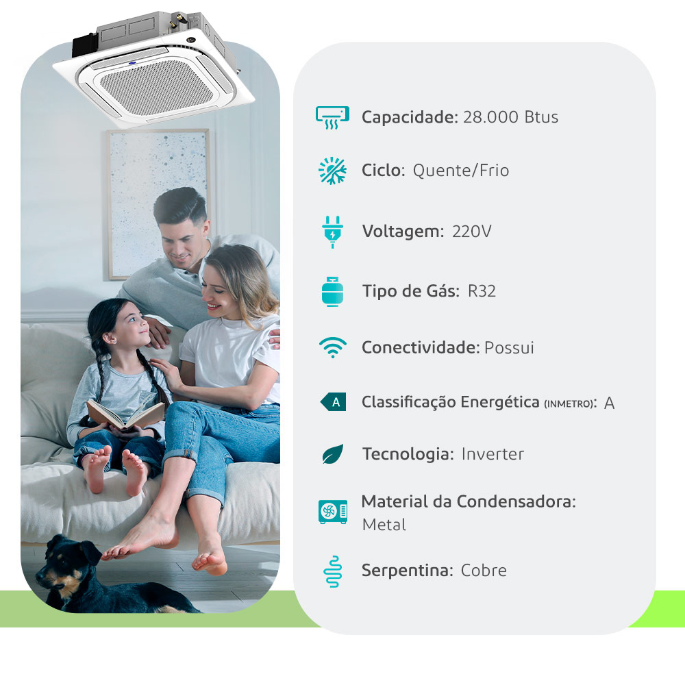 | Modelo/Descrição | O Ar-condicionado Split Cassette 4 Vias Inverter Carrier estabelece um novo padrão de climatização para grandes áreas, oferecendo distribuição de ar precisa em salas amplas, escritórios, lojas, restaurantes, ambientes comerciais e residências. Com design discreto, proporciona conforto suave com a Função Breezeless, além de permitir um controle individual das quatro saídas de ar. Por fim, através do aplicativo SmartHome é possível controlar e regular a temperatura ideal à distância, além de comandar por voz diversas funções do produto. Disponível em: 18.000, 24.000, 28.000, 36.000, 48.000, 54.000, 58.000 BTUs. |
