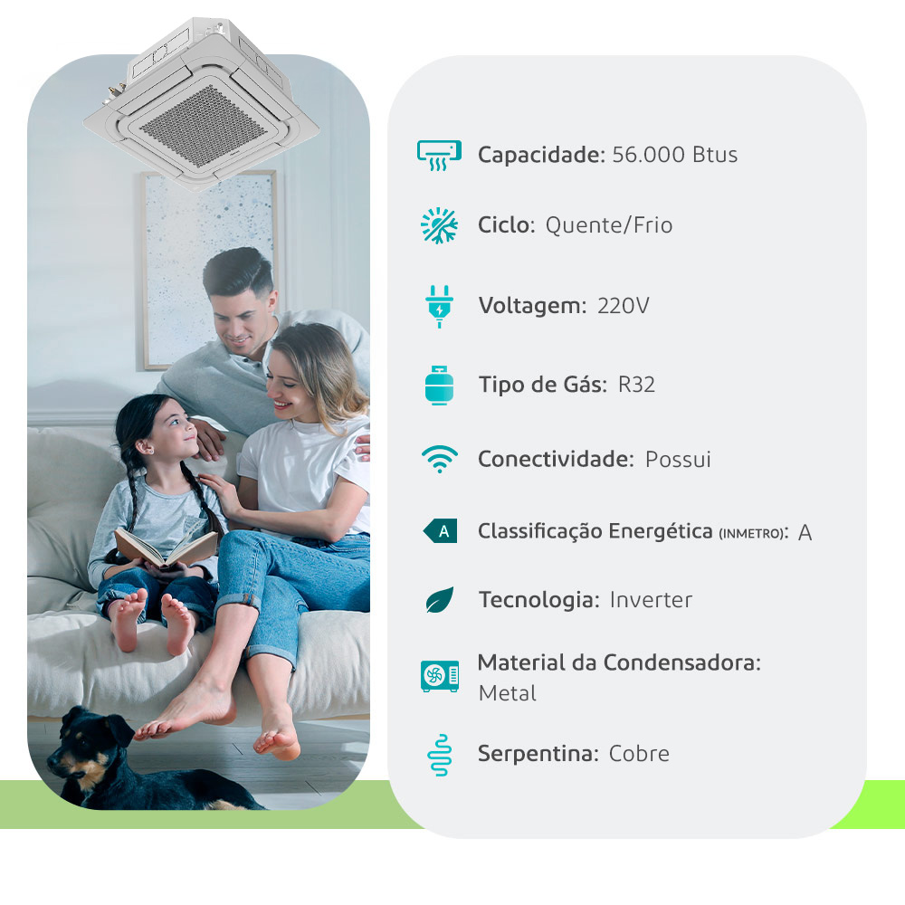 Unindo eficiência, conectividade e design elegante, o Ar-Condicionado Cassete 4 Vias é a escolha perfeita para quem busca potência, economia e conforto em um só equipamento. Ideal para projetos comerciais e corporativos que exigem desempenho e sofisticação.