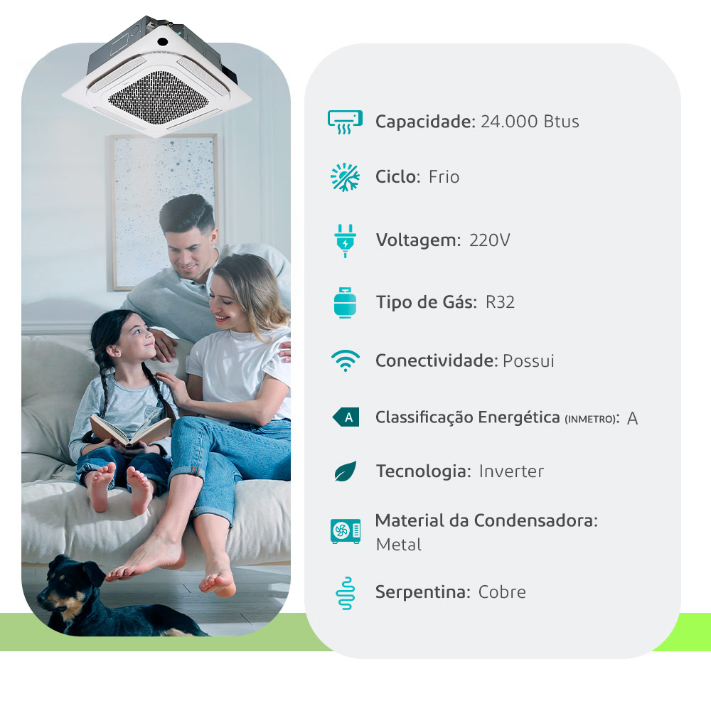 | Modelo/Descrição | O Ar-condicionado Split Cassette 4 Vias Inverter Midea estabelece um novo padrão de climatização para grandes áreas, oferecendo distribuição de ar precisa em salas amplas, escritórios, lojas, restaurantes, ambientes comerciais e residências. Com design discreto, proporciona conforto suave com a Função Breezeless, além de permitir um controle individual das quatro saídas de ar. Por fim, através do aplicativo SmartHome é possível controlar e regular a temperatura ideal à distância, além de comandar por voz diversas funções do produto. Disponível em: 24.000, 36.000 e 60.000 BTUs. |