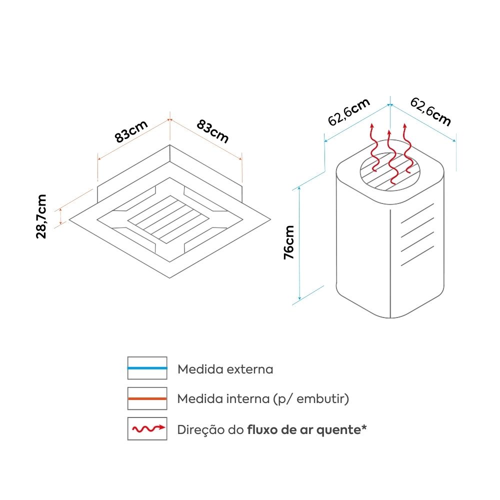 | Modelo/Descrição | O Ar-condicionado Split Cassette 4 Vias Inverter Midea estabelece um novo padrão de climatização para grandes áreas, oferecendo distribuição de ar precisa em salas amplas, escritórios, lojas, restaurantes, ambientes comerciais e residências. Com design discreto, proporciona conforto suave com a Função Breezeless, além de permitir um controle individual das quatro saídas de ar. Por fim, através do aplicativo SmartHome é possível controlar e regular a temperatura ideal à distância, além de comandar por voz diversas funções do produto. Disponível em: 24.000, 36.000 e 60.000 BTUs. |
