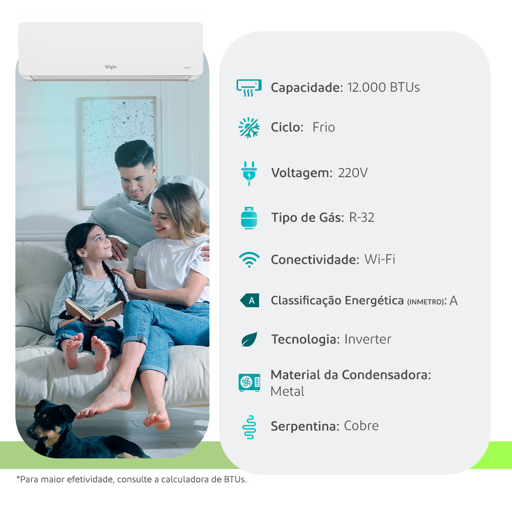 | Garantia do Produto | Produtos instalados por empresas credênciadas ELGIN terão 3 anos de garantia total no produto, por empresas NÃO credenciadas a garantia é de 1 ano. Para o compressor inverter, a garantia será de 10 anos (3 meses de garantia legal mais 117 meses de garantia contratual), desde que a instalação seja realizada por assistência técnica autorizada ELGIN e seja apresentado o comprovante de instalação CTI (Controle Técnico de Instalação). Para mais informações, consulte o manual do produto. |