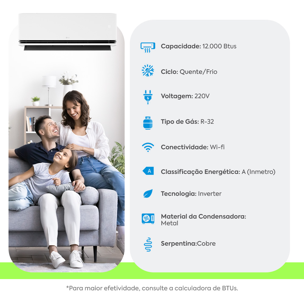 | Modelo/Descrição | Ar-Condicionado LG Dual Inverter Uniq +AI 3.0 12.000 BTU Quente/Frio 220V - S3-W121L1C0 |