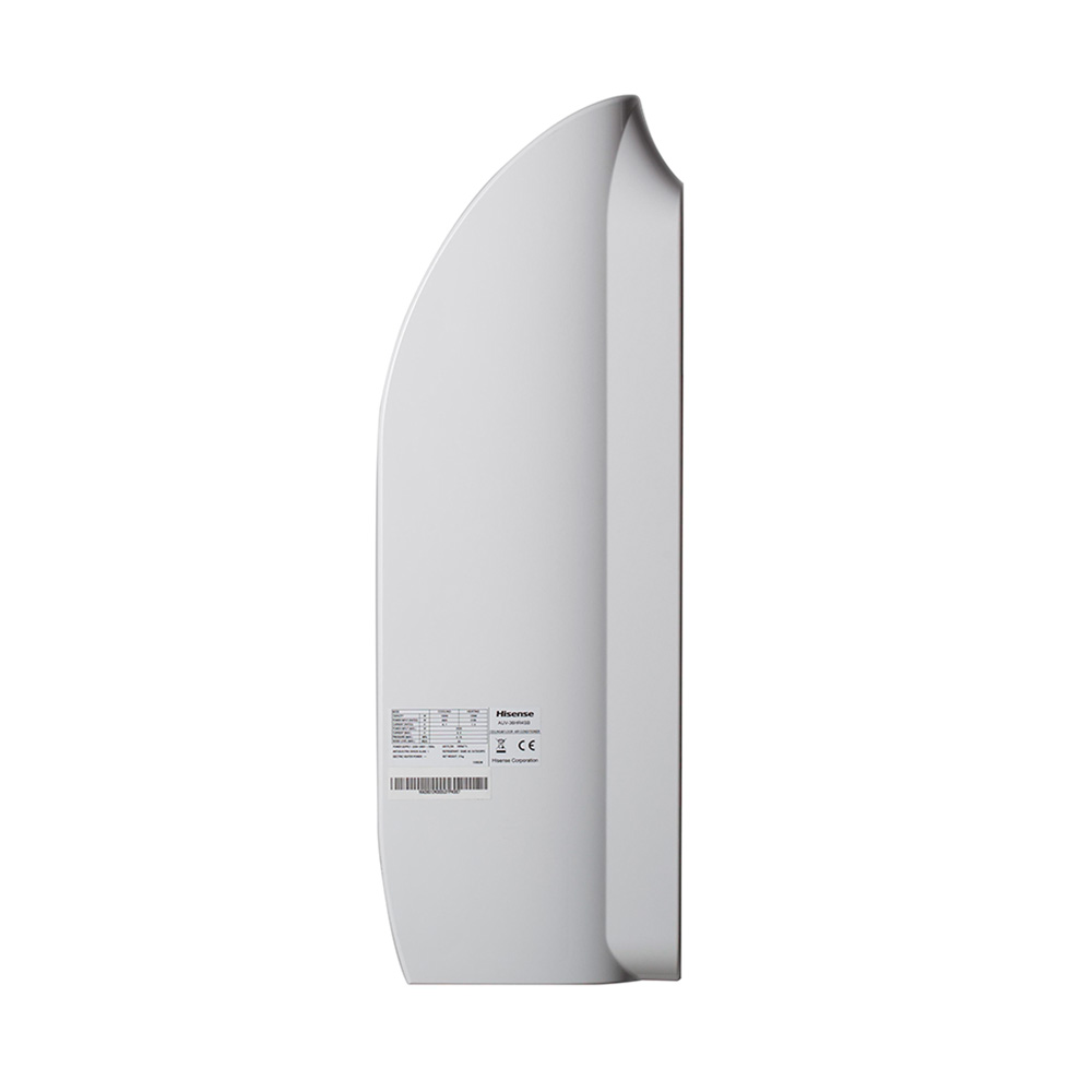 Com acabamento branco brilhante e superfícies suaves, a unidade interna apresenta um visual elegante e minimalista. O sistema de fixação com parafusos ocultos garante uma instalação limpa, seja no teto ou na parede, ideal para espaços comerciais ou residenciais que valorizam a estética sem abrir mão da performance.