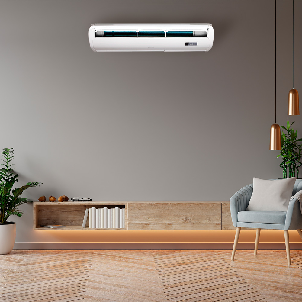 Com um painel branco brilhante e acabamento suave, o design do Hisense Piso Teto foi cuidadosamente pensado para se integrar de forma harmônica à decoração. Os parafusos e porcas de fixação ficam completamente ocultos, garantindo um visual limpo e sofisticado — ideal para ambientes que exigem estética refinada sem abrir mão da eficiência.