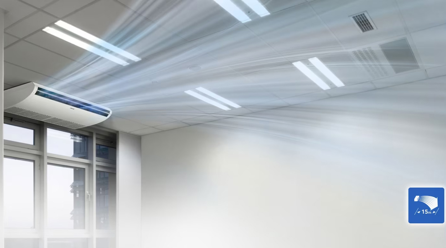 O poderoso resfriamento do Ar-Condicionado Inverter Samsung Teto permite resfriar um maior espaço em menos tempo com um alcance maior. A aleta pode variar de 4° a 45° e a flecha de ar possui um alcance de até 15 metros.